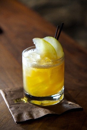 In a glass with ice, combine the Clyde May’s Whiskey, Bonal, and fresh orange juice. Stir in the apple jam, and finish with black walnut bitters. Garnish with green apple slices.